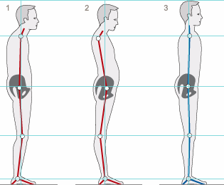 2. Das Becken ist nach vorne gekippt und geschoben. Die Knie sind überstreckt, der Brustkorb ist kollabiert und der Kopf ist nach vorne geschoben. Der Bauchinhalt drückt nach vorne raus. Das Gewicht ist auf den Fersen.